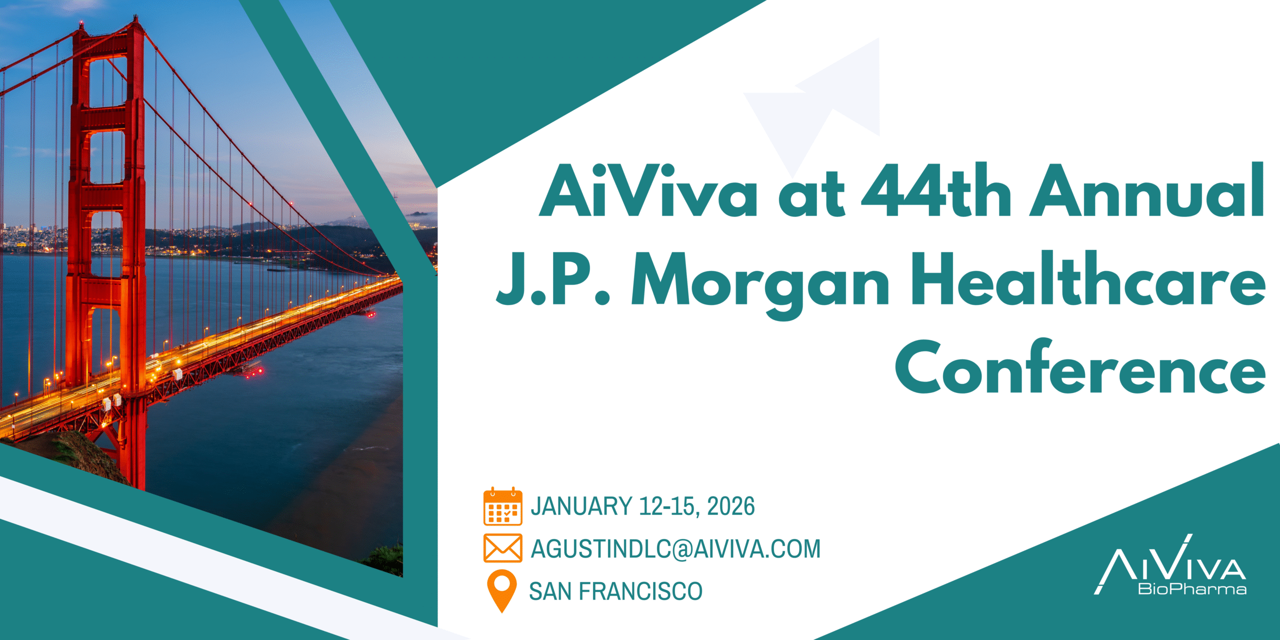 AiViva BioPharma excited to meet executives participating at the J.P.Morgan Healthcare Conference in San Fransico.  Diane Tang-Liu, CEO, and Agustin de la Calle, Vice President of Business Development will be available to meet while in San Francisco during this time. Contact Agustin to schedule a time to meet:   agustindlc@aiviva.com For more information, visit:  https://www.jpmorgan.com/about-us/events-conferences/health-care-conference www.aiviva.com