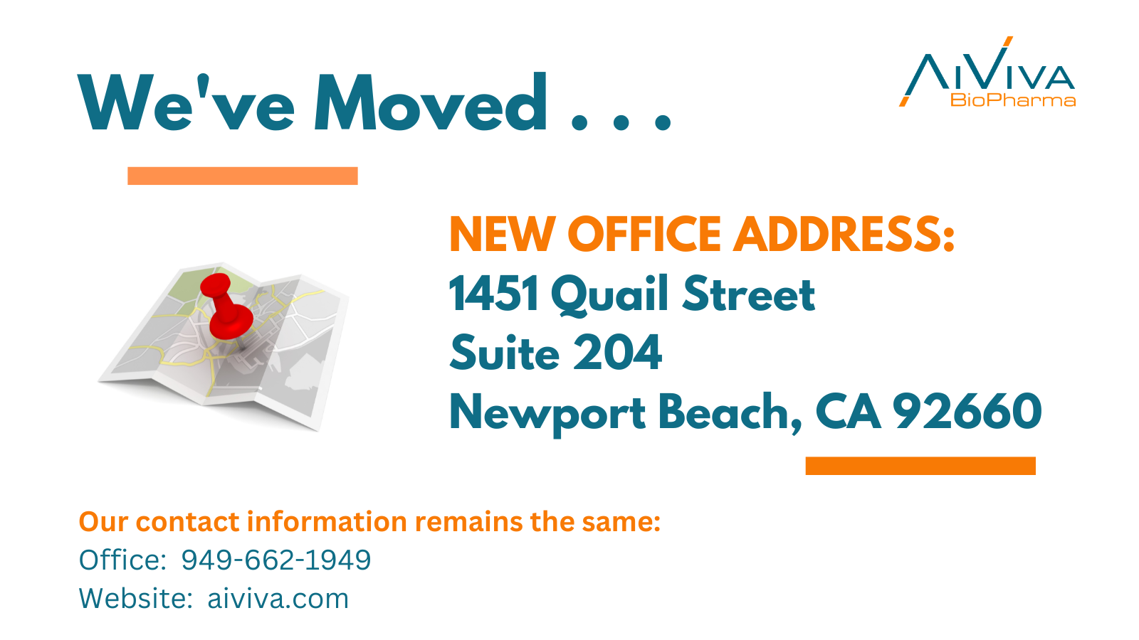 ______________________________________________           We are pleased to share that AiViva has moved to a new office in Newport Beach.            Stop by and visit anytime!